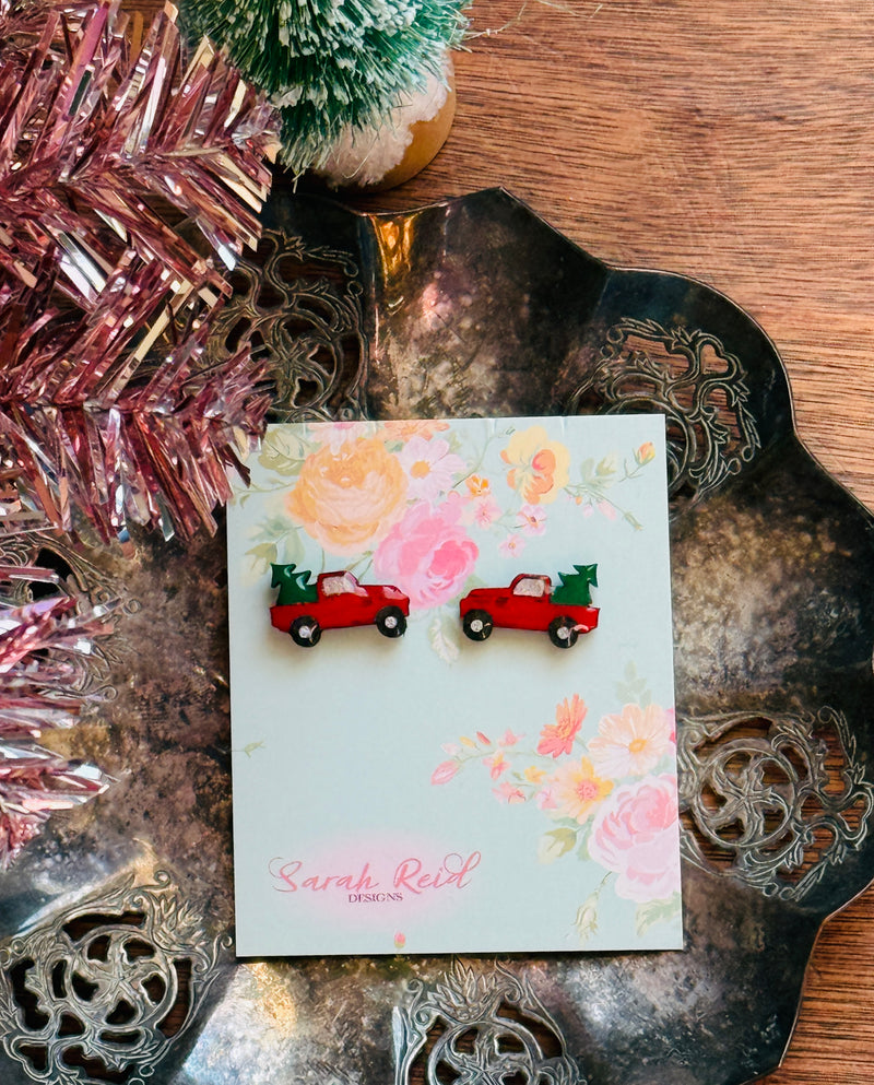 Festive little red trucks with a tree in the back. Each earring is hand painted by me and sealed with resin to add gloss and protection.